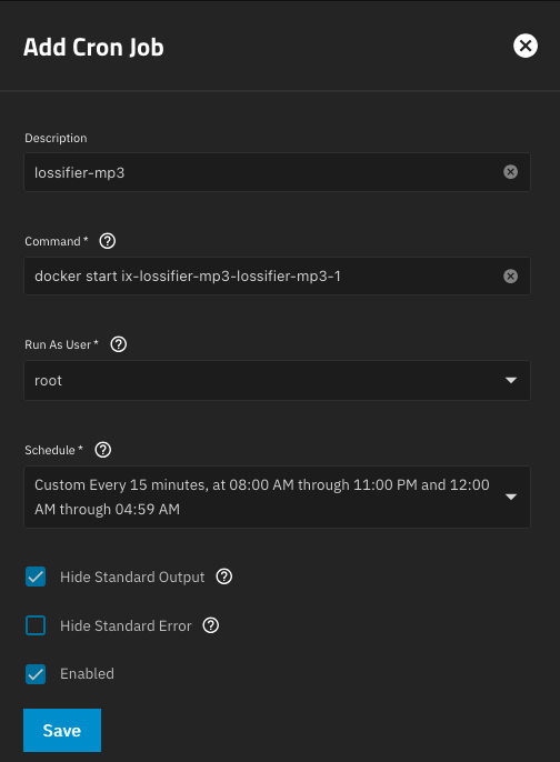 We can use TrueNas’ built in cron tool to kick off a run every 15 minutes, for example. In the UI go to
