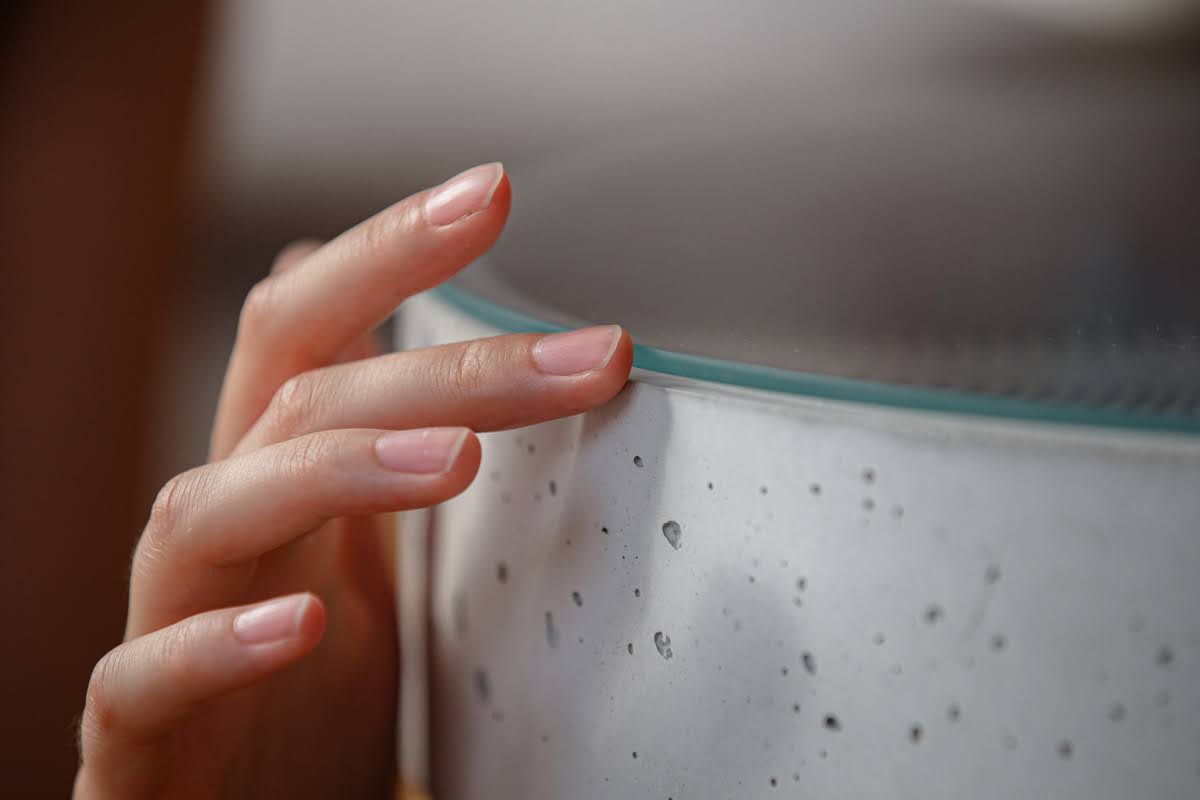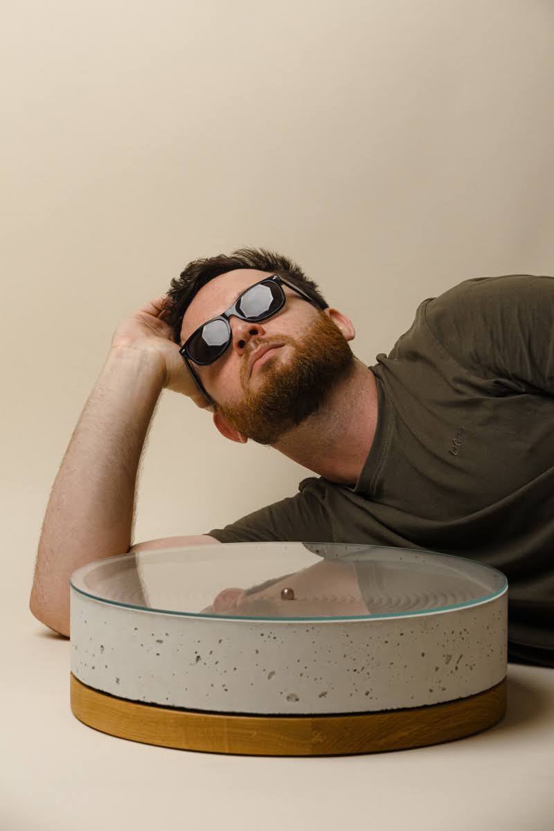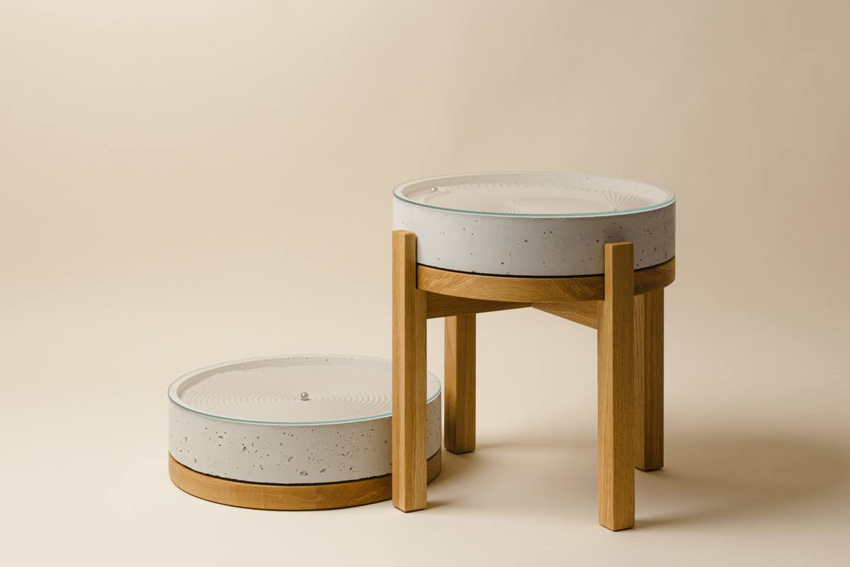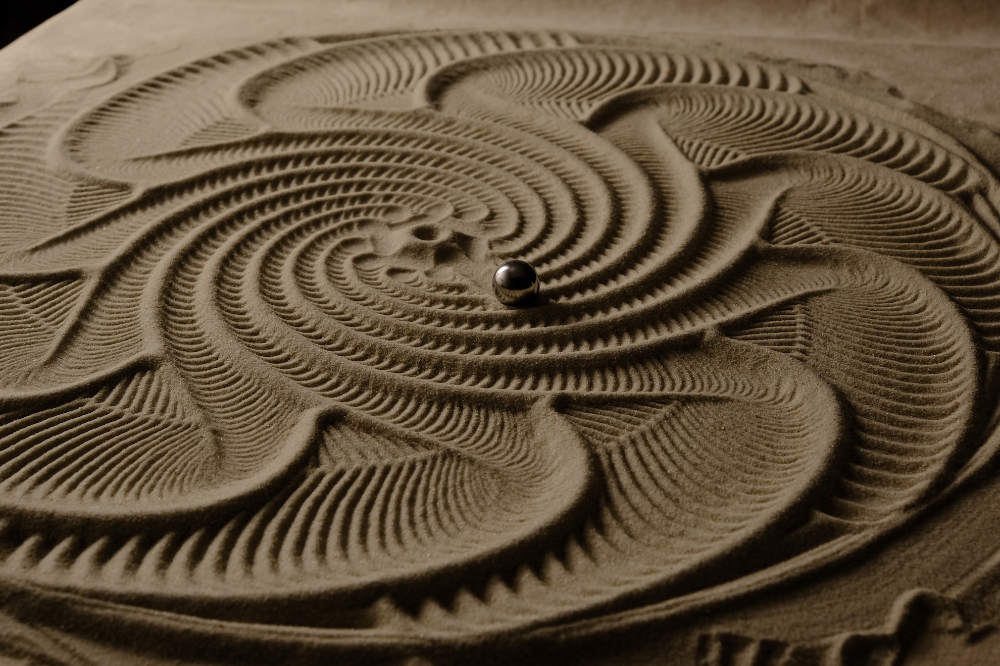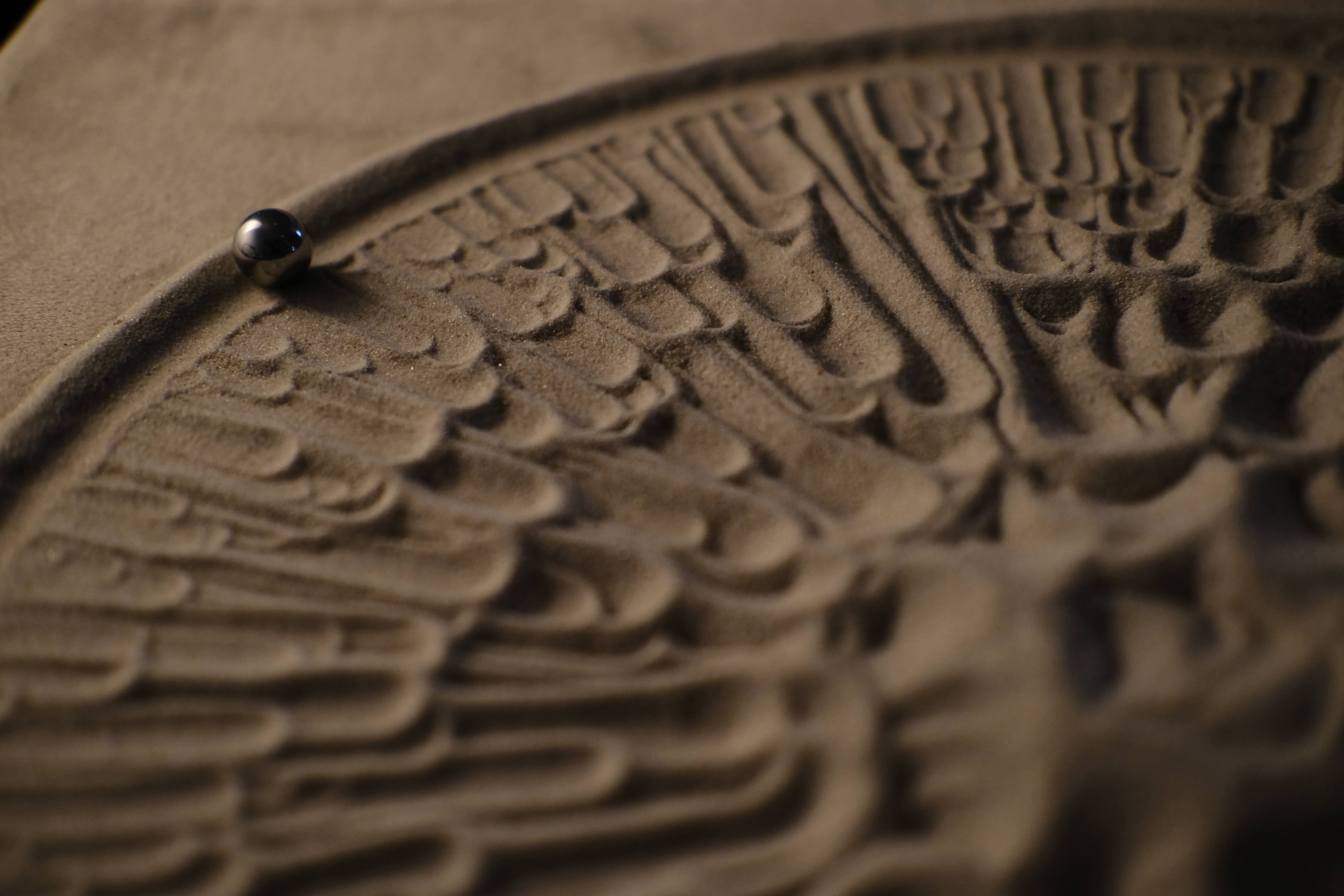 Glass tabletop reveals a layer of sand that is used as a medium. In it, a steel ball traces intricate algorithmic patterns. All is controlled with a near silent mechanism hidden underneath.