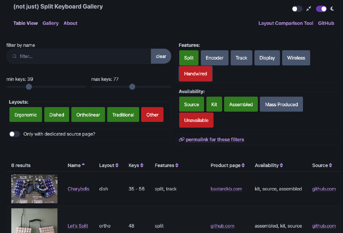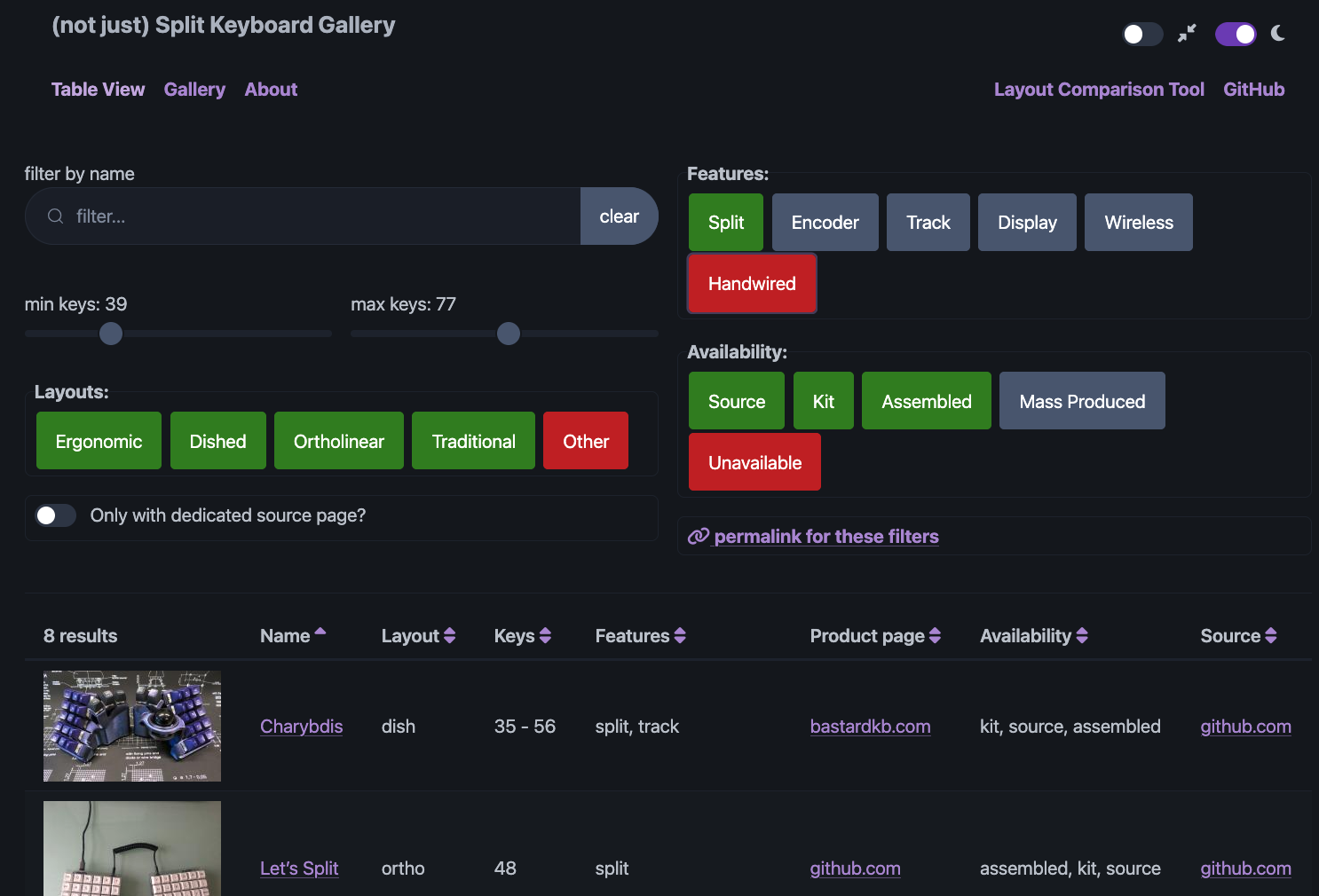 Split Keyboard Gallery - tool for browsing over 100 keyboards and filtering them by properties